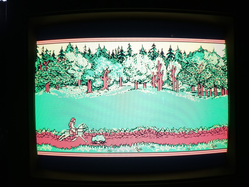 Interestingly, when running the game using a more modern VGA card (in this case, a Cirrus Logic CL-GD5428 VESA Local Bus one) and captured direct to my PC, it uses palette 1 instead, which is the black (#000000), purple (#ff55ff#, cyan (#55ffff) and white (#ffffff). I guess this is part of the CGA emulation that's inaccurate on certain VGA cards.