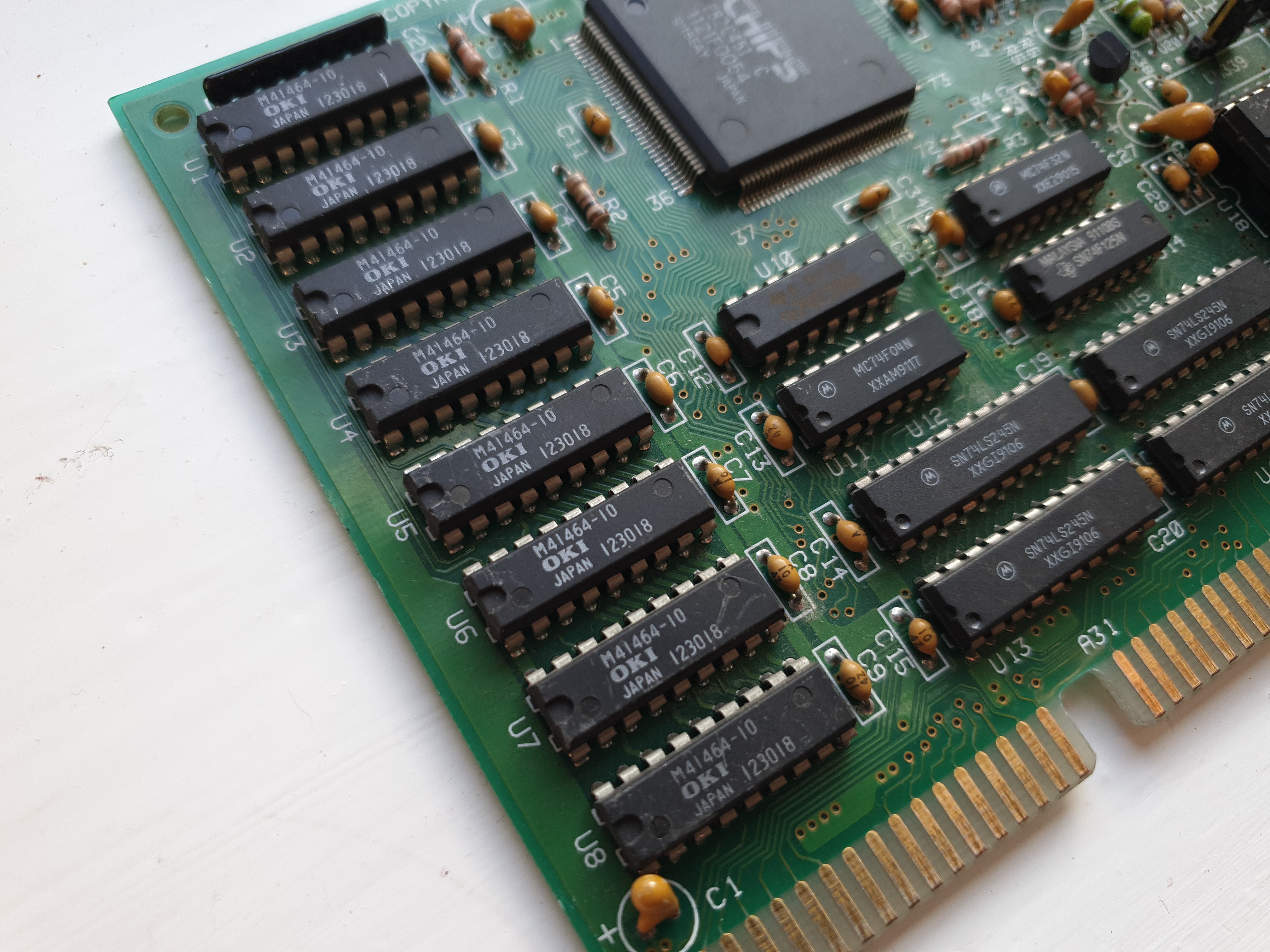 The eight soldered-in memory chips are OKI-branded M41464, and are rated for 100ns access time. Some board revisions appear to come with 80ns-rated memory from Hynix (Hyundai). On cards of this era you won't notice any real-world performance differences in upgrading this to faster RAM, so it's not too much of a negative if you have soldered-in ones.