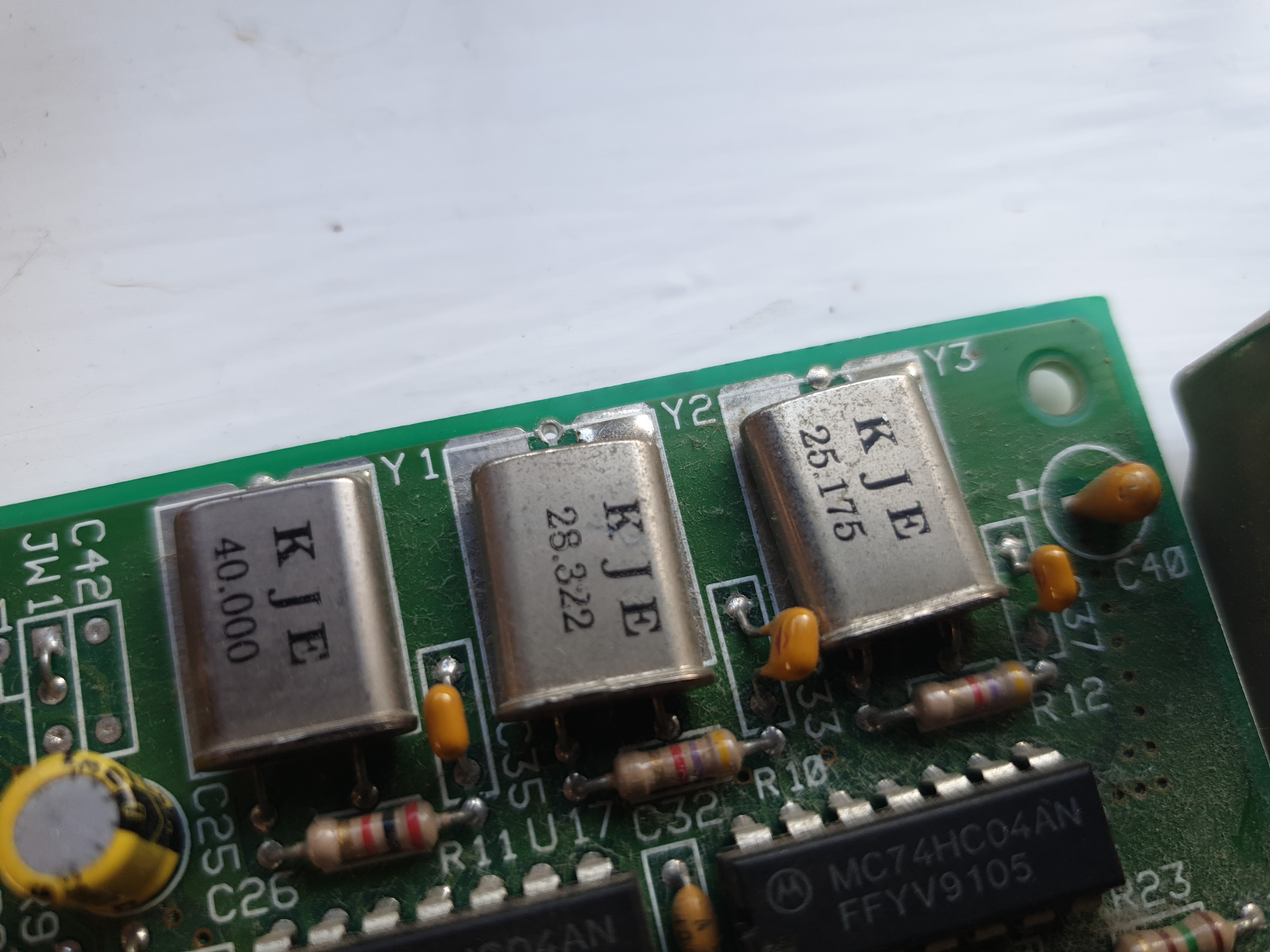 The three crystals on this card are 40 MHz, 28.322 MHz, and 25.175 MHz. Different crystal oscillators are present in order for the card to run at different pixel clocks (a.k.a. dot clocks). The higher the resolution, the higher the frequency the screen redraw (refresh rate) needs to be.
