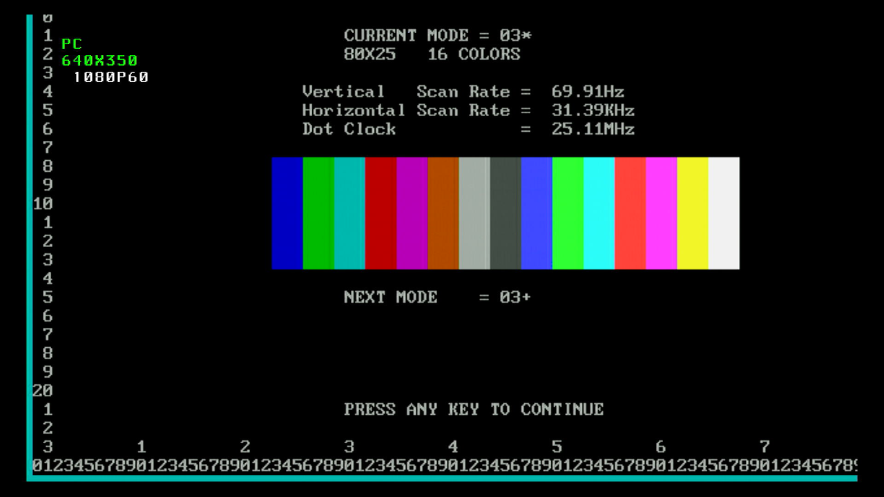 - Mode 3+ (16-color VGA 9x16 character block, 4 display pages)