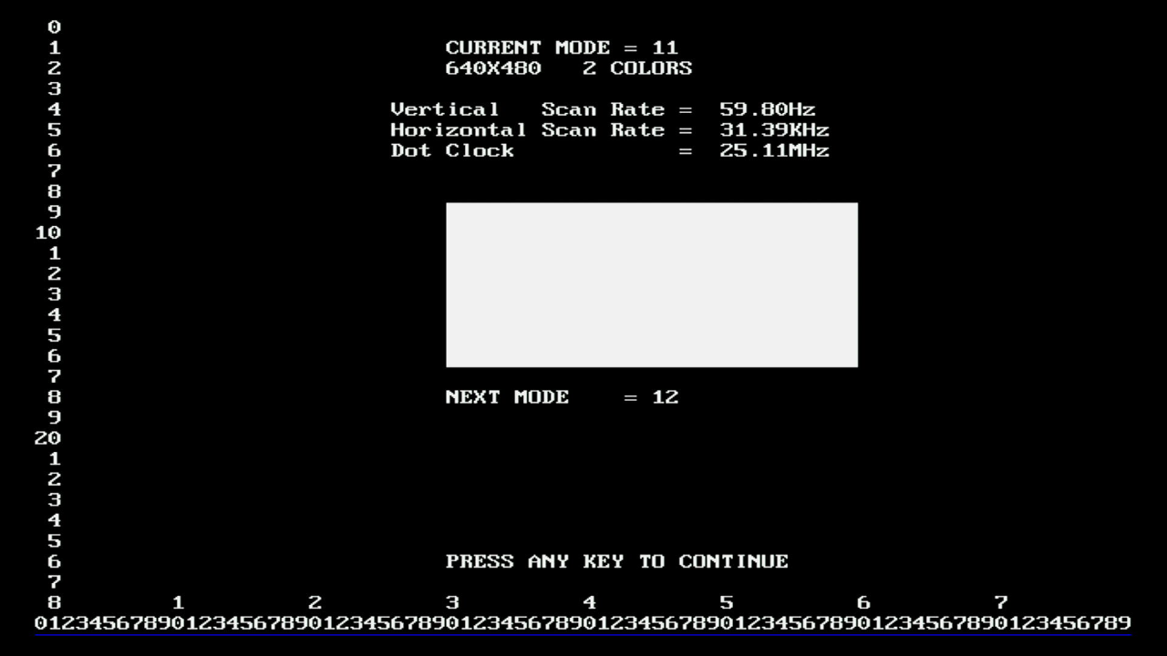 - Mode 0+ (16-color VGA 9x16 character block, 8 display pages)