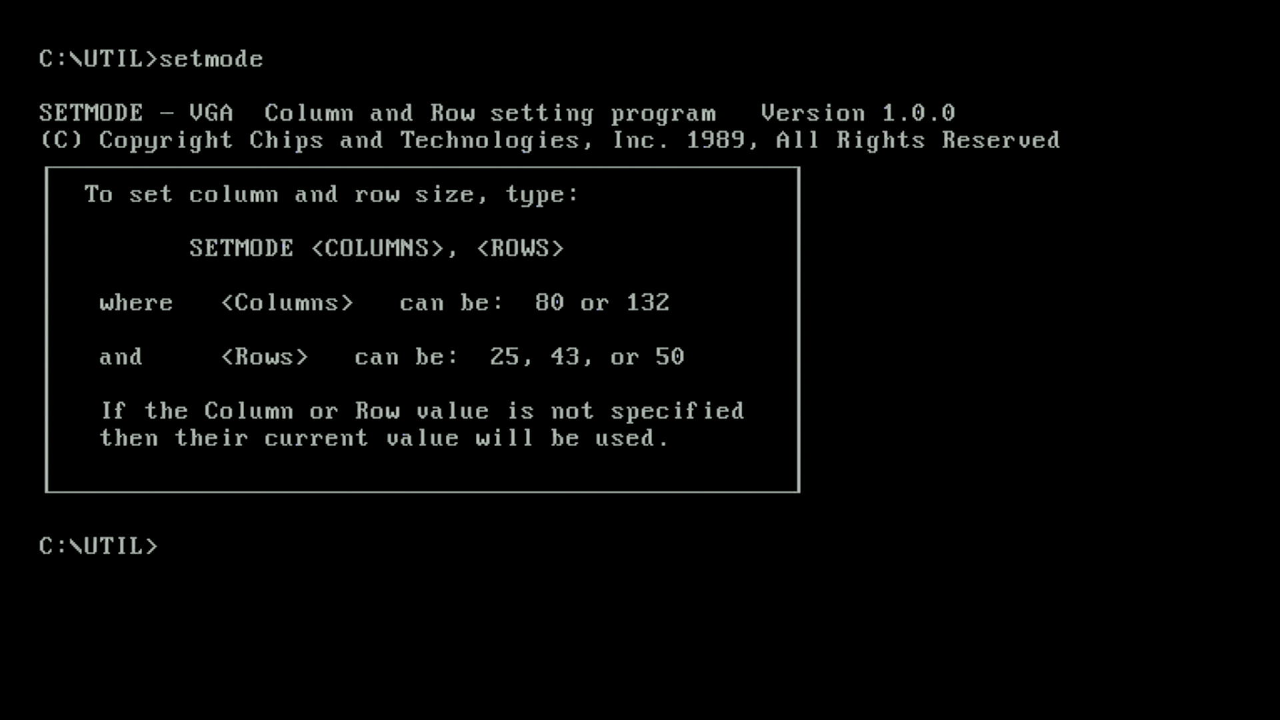 | SETMODE.COM | Similar to the DOS MODE command, sets the text mode to 40x25, 80x25, 132x43, 132x50, etc. |