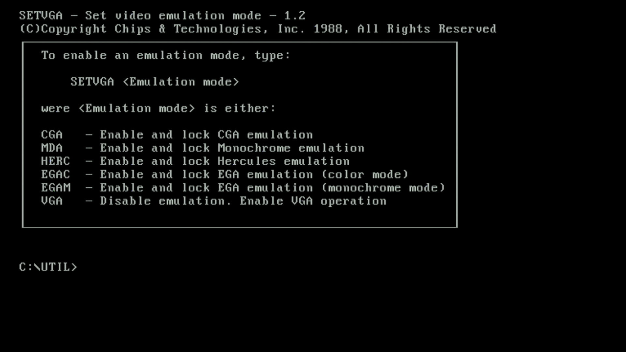 | SETVGA.COM | Enables or disables 'Emulation' mode for other graphics standards. |