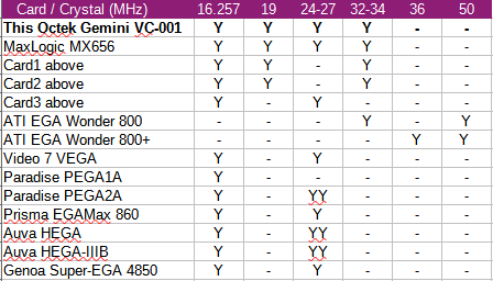 The four crystals on this card are: 32 MHz, 24 MHz, 19 MHz and 16.257 MHz. Different crystal oscillators are present in order for the card to run at different pixel clocks (dot clocks). Comparing this to other EGA cards I've seen, it's quite rare to have four crystals, and is a good sign that this card supports a broad set of display modes. Here's a comparison of other EGA cards and the crystal oscillators found on the board:-