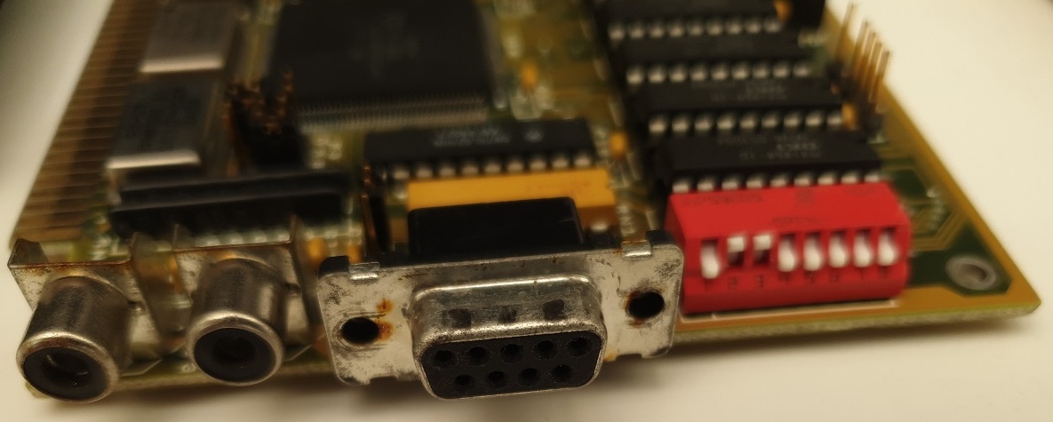 The card's side (missing its faceplate), with the two composite connectors, the DE-9,