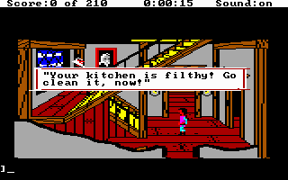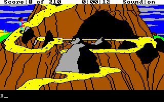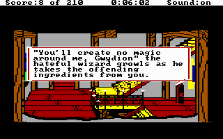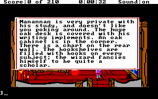 The second Sierra game I ever played, after Leisure Suit Larry 1. This time, you take on the role of Gwydion who has been kidnapped by Manannan, the wicked wizard. Gwydion is King Graham’s son, and he was abducted and taken from his home in Daventry when he was a child. Gwydion, who dwells on top of a mountain in the realm of Llewdor, is the protagonist of King’s Quest 3. The limitless ocean extends to the east, while the arid desert is sprawled to the west. Gwydion must scour the areas around the mountain for spell materials that would allow him to escape from the nasty Manannan, who makes him perform housework.