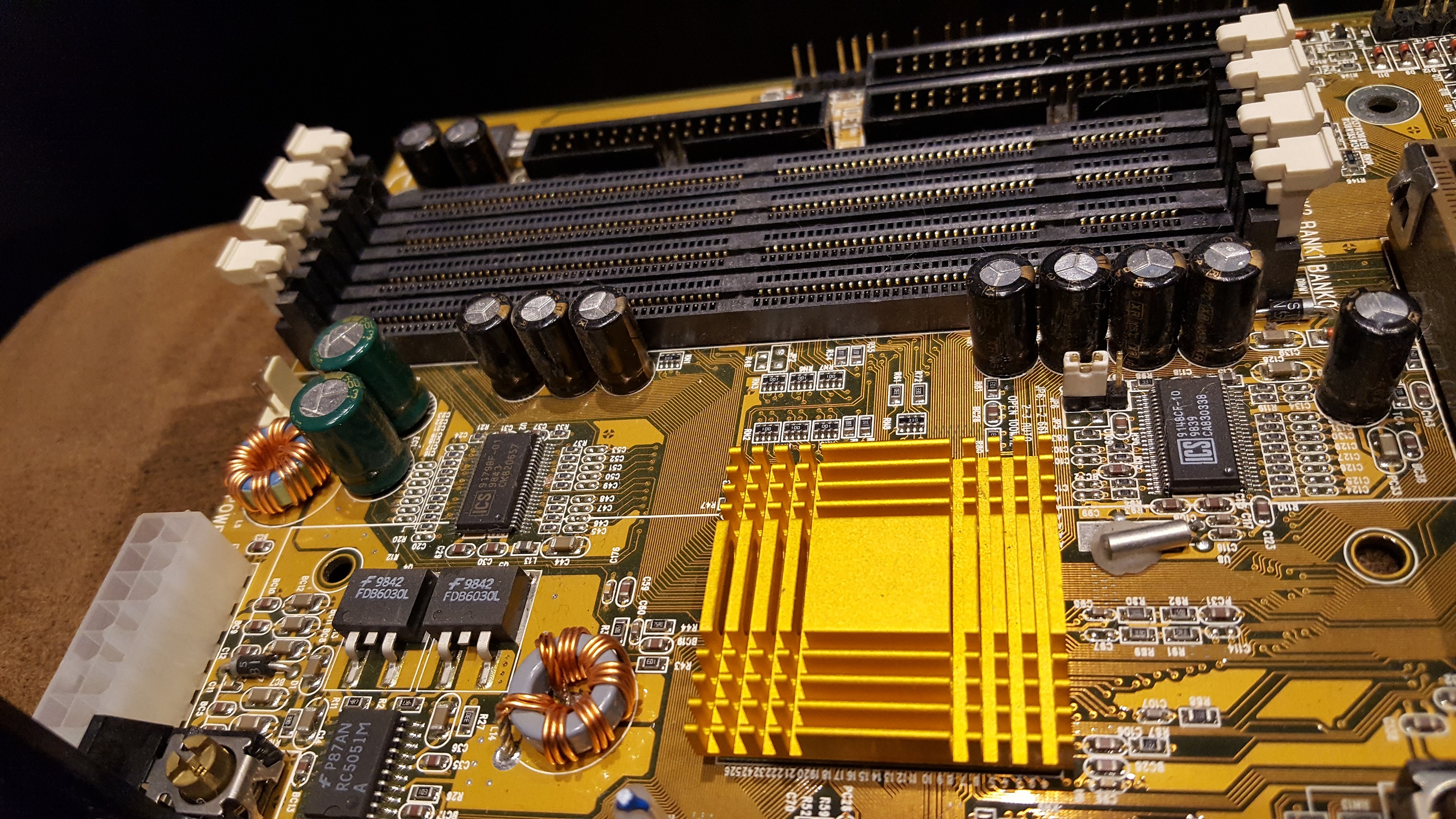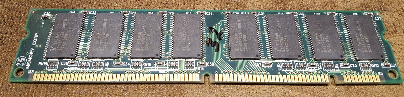 Given the fast 100 MHz bus speed means older RAM types (FPM and EDO) are out. These were barely able to cope at 66 MHz, so could be a serious bottleneck when put into a board like this. Fortunately, the board doesn't even support these. Instead it has four 168-pin DIMM slots that are designed for the new SDRAM type - specifically PC-100 SDRAM (meaning it can run at 100 MHz). The board supports both PC-66 (66 MHz) and PC-100 SDRAM modules from 8 MB up to 256 MB. The motherboard's manual tells me PC-66 is only supported when running the FSB at 66 MHz, which makes perfect sense. I have chosen these DIMM modules for testing with this board: