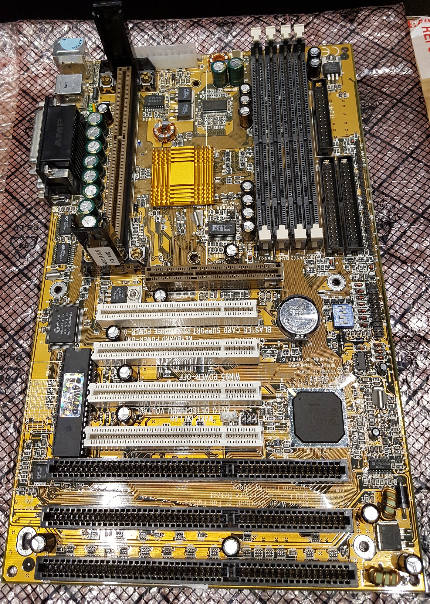 This motherboard is pretty flexible in that it supports Intel processors from the first Pentium II "Klamath" CPUs that arrived in 1997 and ran from 233 MHz up to 633 MHz, up through the Pentium III era, and even the first Celerons (codenamed "Mendocino"). The board also has an abundance of protective circuitry, including an audible warning if the CPU is overheating (in which case it reduces the CPU speed), or if the CPU fan fails.