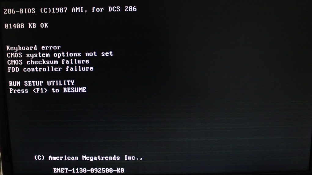 At the bottom of the boot screen we see the BIOS boot string "ENET-1138-092588-K0" - The "E" in "ENET" means the BIOS has Extended Setup program. "NET" refers to "NEAT Chipset", the "1138" is American Megatrends' manufacturer reference number for Win-Win Computer, the "092588" is the BIOS date (25th September 1988), and "K0" is the AMI keyboard BIOS version number.