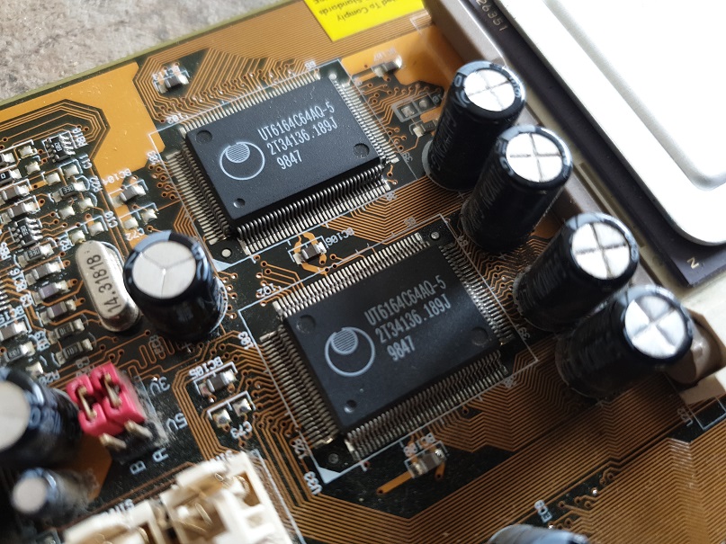 By 1998, the days of having SRAM cache sockets were gone. The cost of static RAM had come right down, so motherboards tended to come with soldered-in cache chips of whatever the maximum the chipset supported. In the case of the M590 here, we have two Utron UT6164C64AQ-5 chips (Utron are a brand of the well-known memory company, Micron Technology). These are configured as 64K x 64 [bit], and hold 512 KB each, giving us a very nice Level 2 cache size of 1 MB.