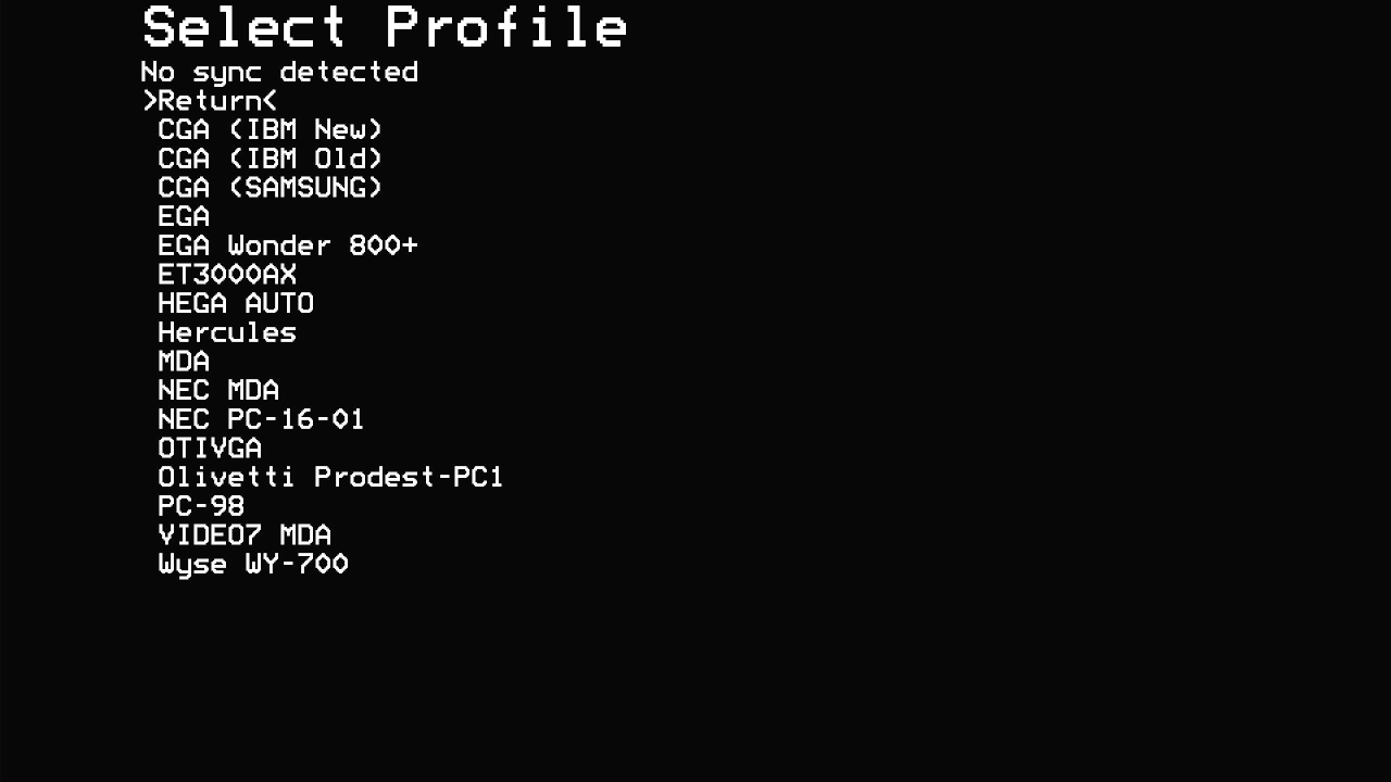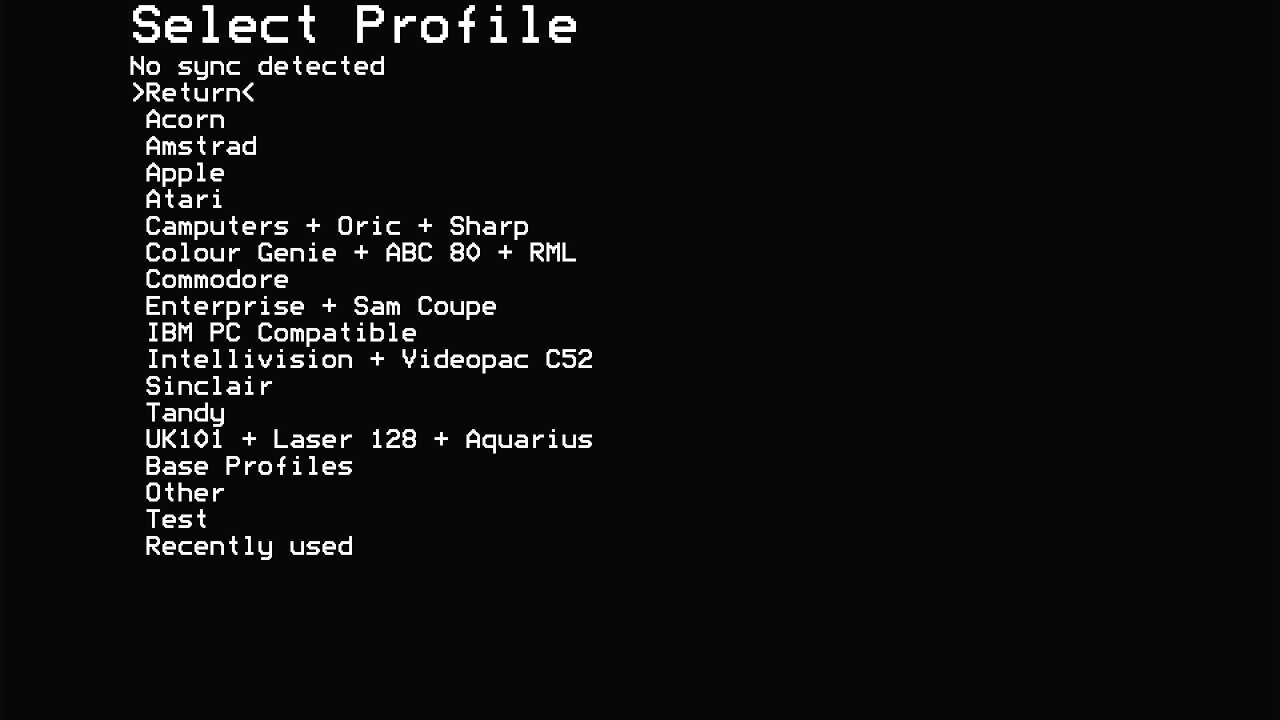 - Profiles - this allows all settings to be saved and recalled quickly for different requirements - great if you plan to use the RGBtoHDMI on a number of different systems, or in my case, a lot of different MDA/Hercules/CGA and EGA cards. Sub-profiles also exist to keep the menu system clean.