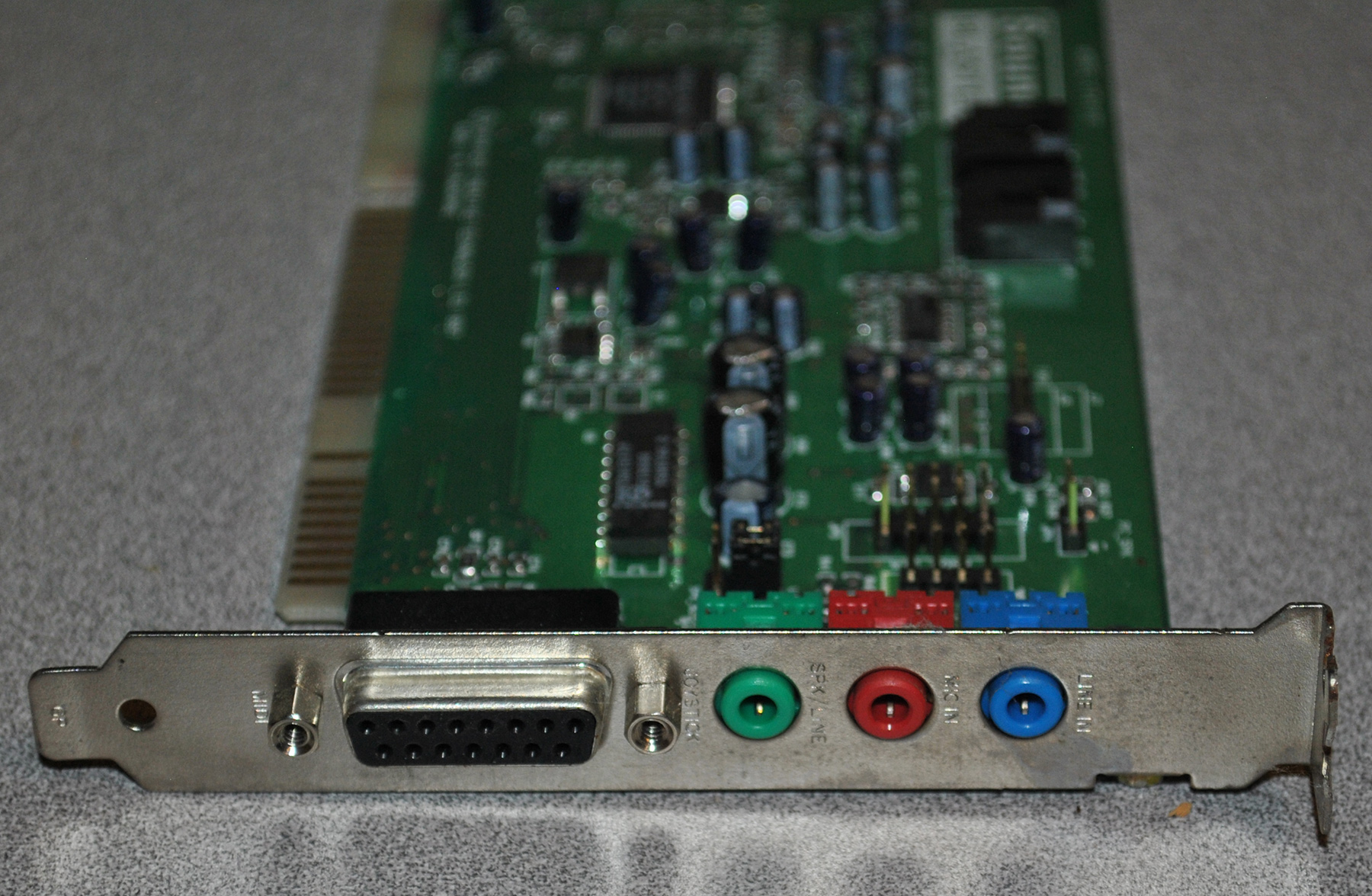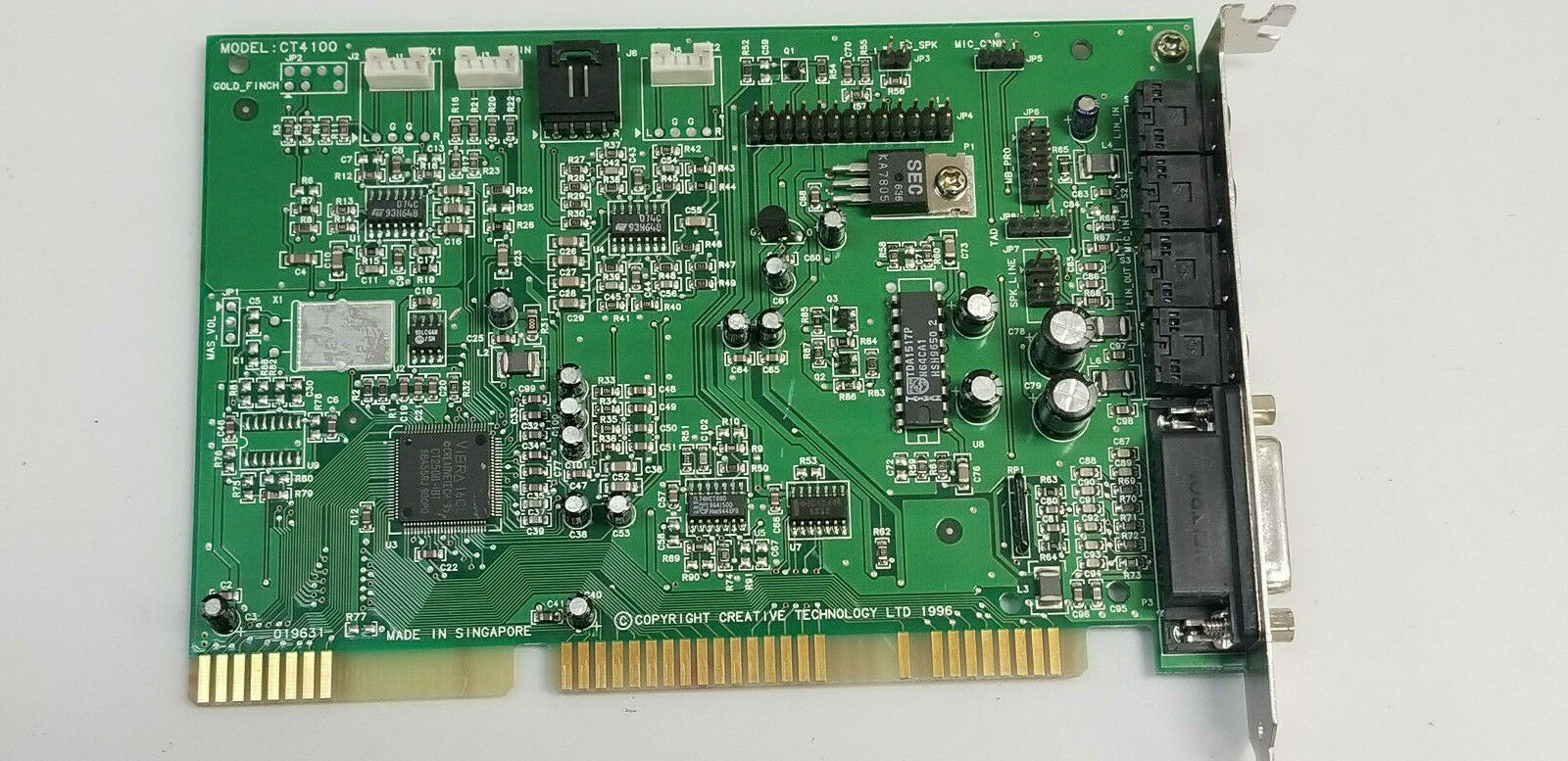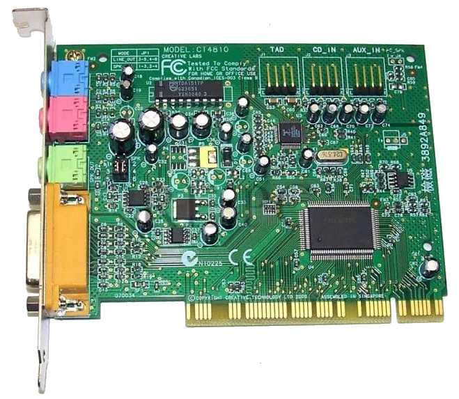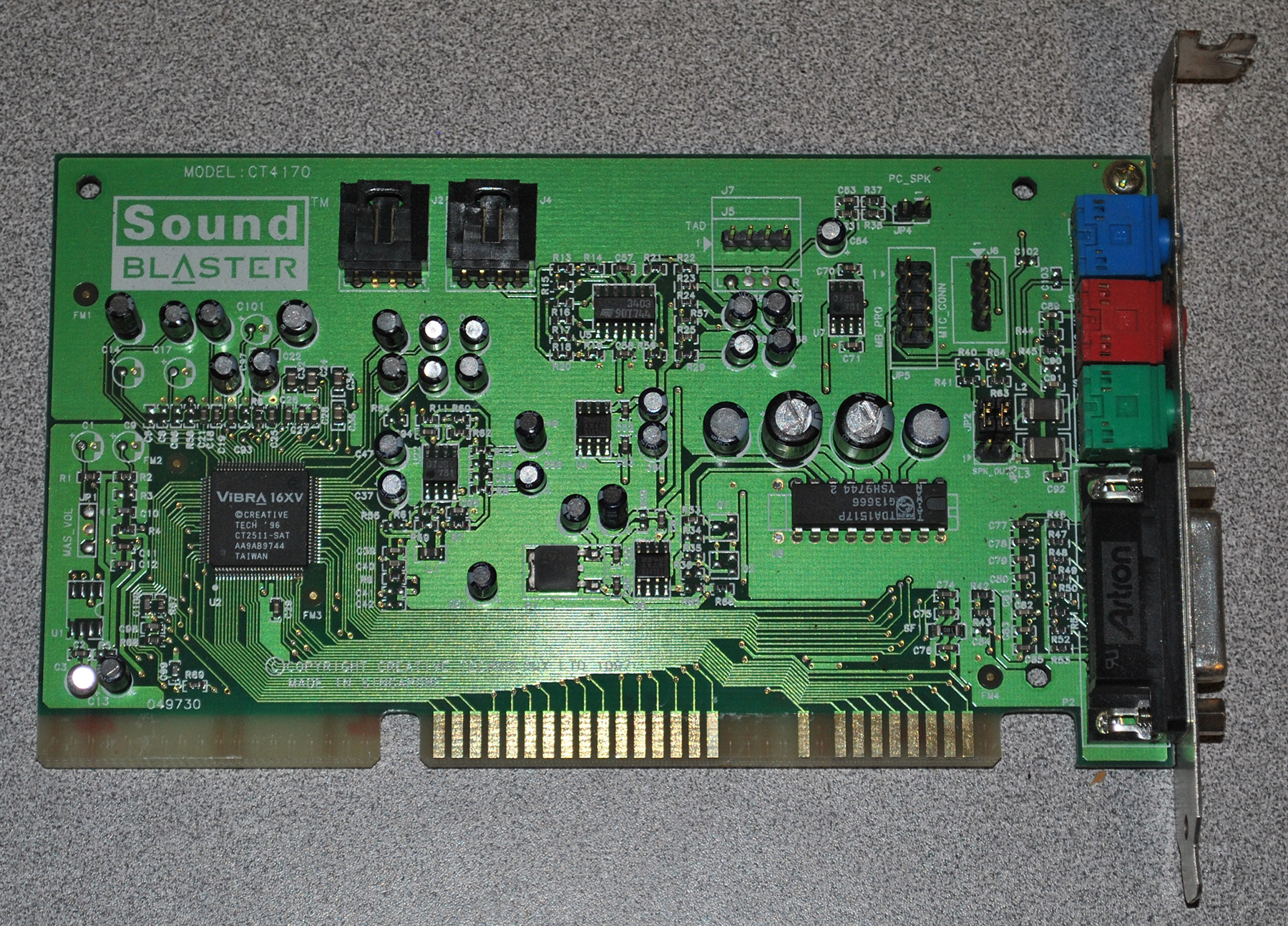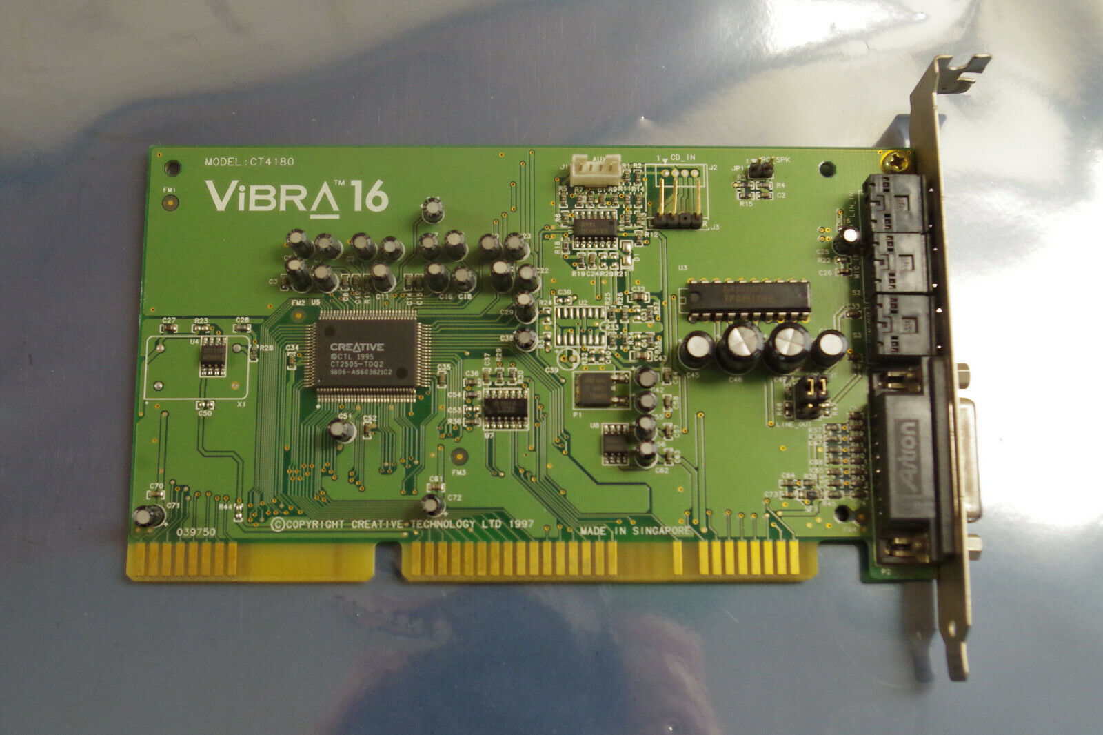 The CT4810, or to give it its full title, Sound Blaster ViBRA 128, was based around the Ensoniq AudioPCI chip, ES1373. ES1373 was a slightly updated version of their earlier ES1371, adding I2S In or S/PDIF Output (the blue Line-In and green Line-Out sockets double up to support these respectively).