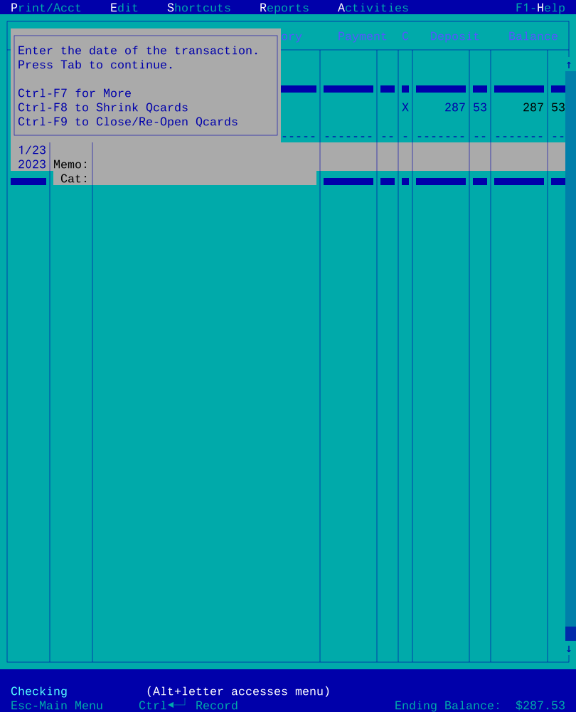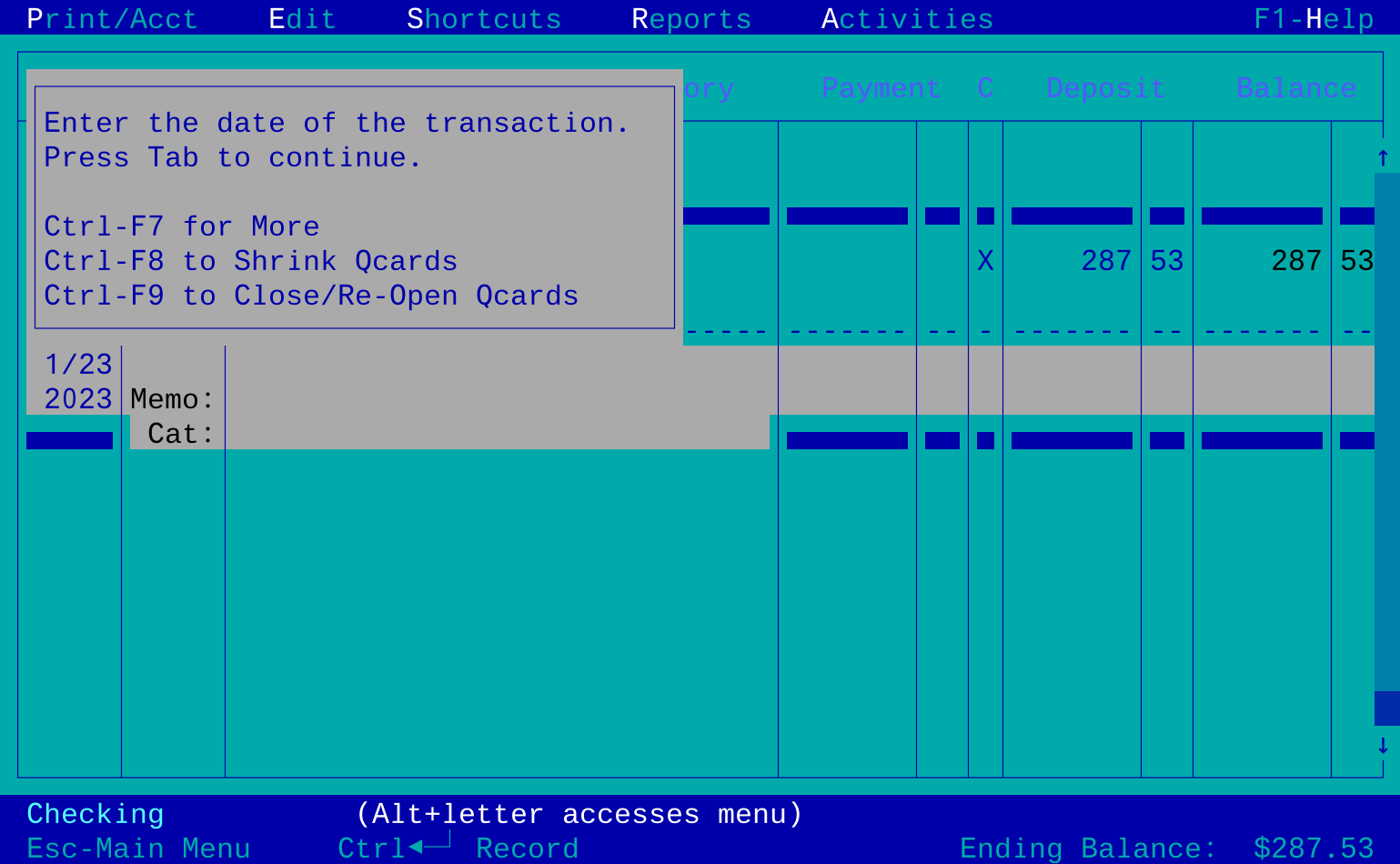 DOSBox ran Quicken really well. The colours are a bit difficult to get used to out of the box ("Navy/Azure" is what they call it), so I changed it in the second image below, while at the same time tested the 43-line mode, which also worked well: