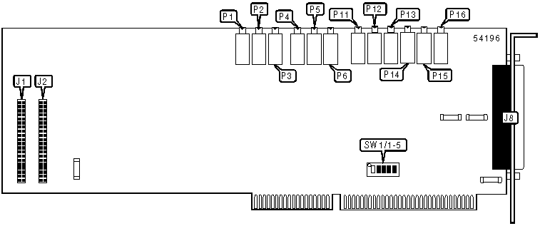 Note: A total of 32 base address settings are available. The switches are a binary representation of the decimal memory addresses. SW1/1 is the Most Significant Bit and jumper SW1/5 is the Least Significant Bit. The jumpers have the following decimal values: SW1/1=512, SW1/2=256, SW1/3=128, SW1/4=64, SW1/5=32. Turn off the switches and add the values of the switches to obtain the correct memory address. (On=1, 0ff=0) | ||||||