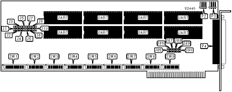 Note:When using the daisy-chain connectors, the board may only use one interrupt. Up to four boards may be daisy-chained. Daisy-chaining boards to operate as one unit will only function under MS-DOS and compatible operating systems. | ||