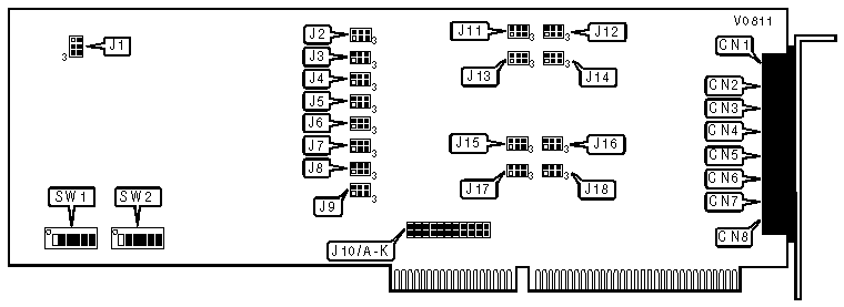 Note:J2 - J9 control the configurations of CN1 - CN8, respectively. Each RJ-11 port may be configured differently. |