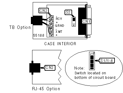 Network interface (CN2) is available with several connector options. Device may feature a terminal block, RJ-11, RJ-45, or 25-pin (male or female) connector.