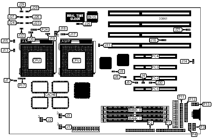 Note: Board accepts EDO memory. Board also accepts x 32 SIMMs. Do not use 16M x 36 SIMMs that have 36 chips.