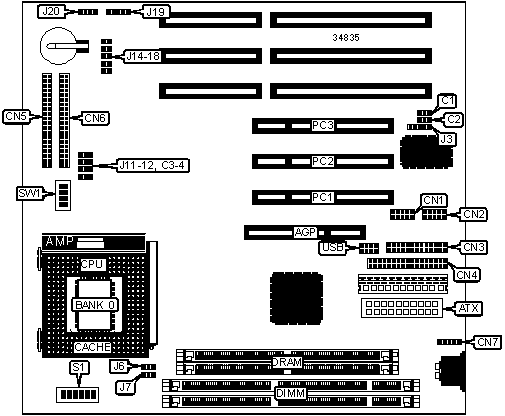 32-bit PCI slots (3), floppy drive interface, IDE interfaces (2), parallel port, PS/2 mouse interface, serial ports (2), IR connector, USB connector, ATX power connector, AGP slot |
