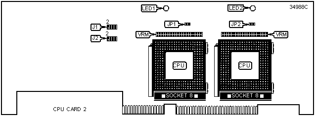 Note: The LEDs on CPU Card 1 and CPU Card2 are ‘overheat’ indicators. If any of these LEDs come on on either card, turn computer off as soon as possible to prevent damage. Note: If installing CPU card 1 only, insert the terminator card in CPU socket 2. Do not use CPU card 2 only |