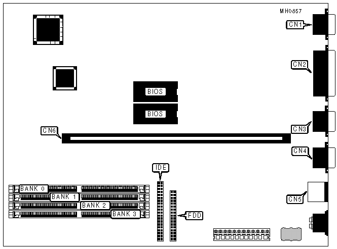 Note: The simplest memory configuration is shown to conserve space. In practice, any bank may be filled with any type of SIMM, as long as Bank 0 is filled first, Bank 1 second, etc. and the total memory is less than 32MB. |
