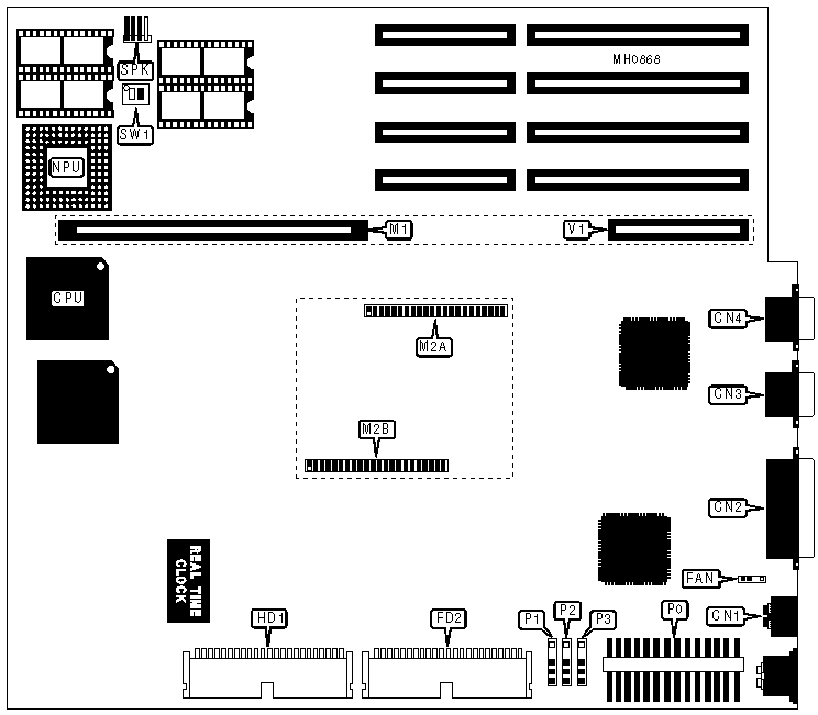 VGA feature connector, proprietary system memory card slot, proprietary system memory module interface, VGA port, parallel port, serial port, bus mouse port, IDE interface, floppy drive/tape drive interface |