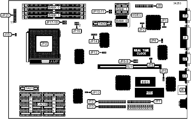 Floppy drive interface, green PC connector, IDE interfaces (2), parallel port, PS/2 mouse port, serial ports (2), VGA feature connector, VGA port, riser slot |