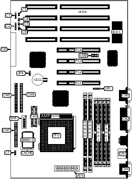 32-bit PCI slots (4), floppy drive interface, IDE interfaces (2), parallel port, PS/2 mouse interface, serial ports (2), IR connector, USB connector, ATX power connector, SMM connector