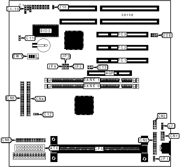 32-bit PCI slots (3), floppy drive interface, green PC connector, IDE interfaces (2), parallel port, PS/2 mouse interface, serial ports (2), IR connector, USB connector, ATX power connector, AGP slot, SB-link connector, wake on LAN connector