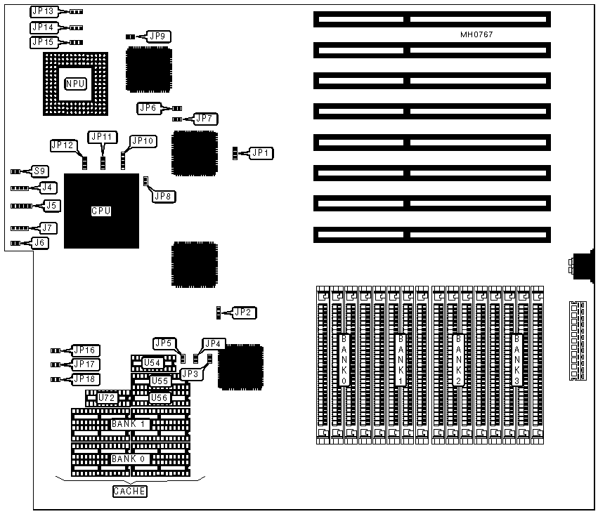 Note:In order to configure your cache for 512K, your board needs to have been specifically ordered. The difference will be that bank 1 will be made up of (4) 32 pin DIP sockets, instead of (4) 28 pin DIP sockets.