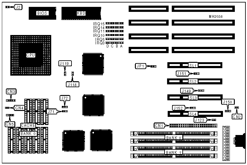 Note:To select a particular IRQ setting for a particular PCI slot, short the two pins located at the intersection of the row that corresponds to that IRQ setting and the column that corresponds to that slot. The IRQ address settings selected for the four PCI interface slots by these jumpers must be identical to the address settings defined for the PCI slots on page 2 of the BIOS setup utility.