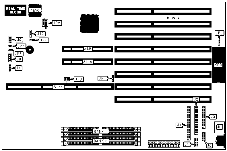 CPU slot, 32-bit VESA local bus slots (2), floppy drive interface, IDE interface, SCSI interface (optional), parallel port, PS/2 mouse port, serial ports (2)