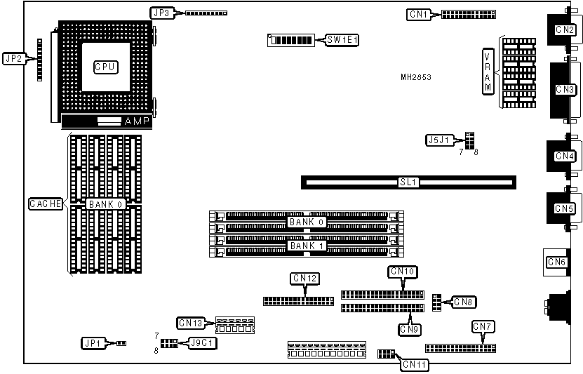 Note: The actual sizes of jumpers CN7, CN8, CN10, JP2, JP3 are unidentified. They are shown for location purposes only.
