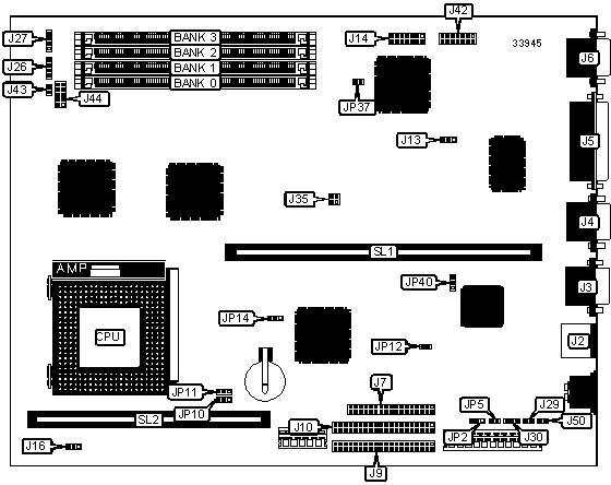 Floppy drive interface, IDE interfaces (2), parallel port, PS/2 mouse port, serial ports (2), VESA video feature connector, VGA port, riser slot, cache slot, feature connector, VGA interface, power supply connectors (2)