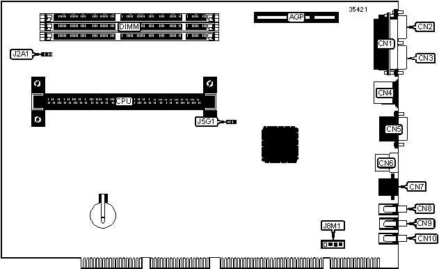 Ethernet 10BaseT connector, parallel port, PS/2 mouse port, serial ports (2), VGA port, USB connector, AGP slot, line in, line out, microphone in, audio in – CD-ROM