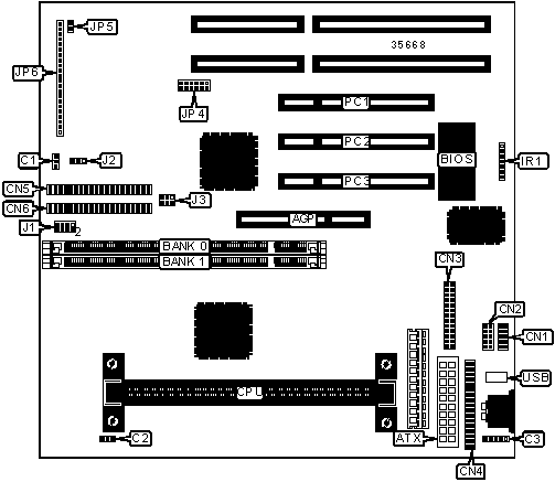 32-bit PCI slots (3), floppy drive interface, green PC connector, IDE interfaces (2), parallel port, PS/2 mouse interface, serial ports (2), IR connector, USB connector, ATX power connector, AGP slot |