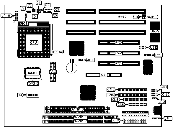 32-bit PCI slots (3), floppy drive interface, IDE interfaces (2), parallel port, PS/2 mouse interface, serial ports (2), IR connector, USB connector, ATX power connector, AGP slot
