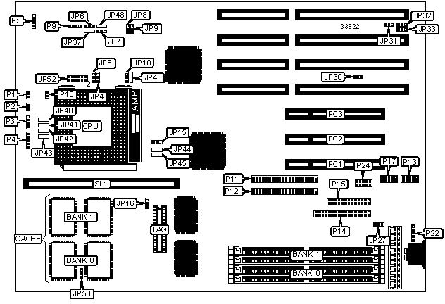 Note: Board accepts EDO memory. Board also accepts x 32 SIMMs. Banks are interchangeable. | ||