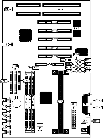 32-bit system 32-bit PCI slots (5), floppy drive interface, IDE interfaces (2), parallel port, PS/2 mouse port, serial ports (2), IR connectors (2), USB connectors (2), ATX power connector, AGP slot |