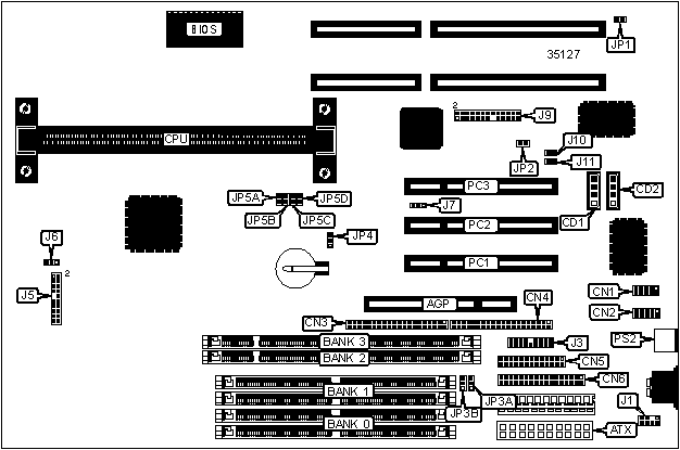 32-bit PCI slots (3), game/sound connector, Audio in - CD-ROM (2), floppy drive interface, IDE interfaces (2), parallel port, PS/2 mouse port, serial ports (2), AGP slot, ATX power connector, ATX form card connector, green PC connector |