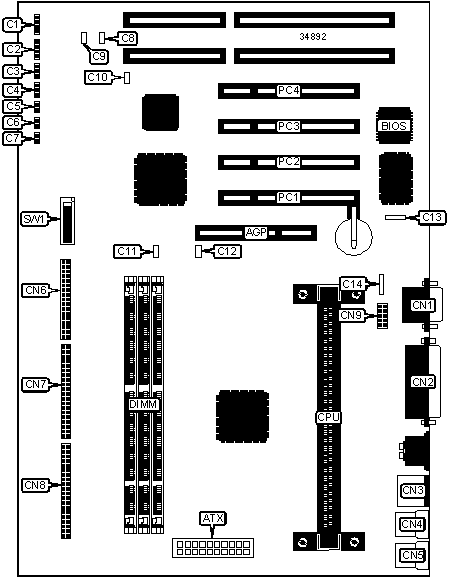 32-bit PCI slots (4), floppy drive interface, green PC connector, IDE interfaces (2), parallel port, PS/2 mouse port, serial ports (2), IR connector, USB connectors (2), ATX power connector, AGP slot
