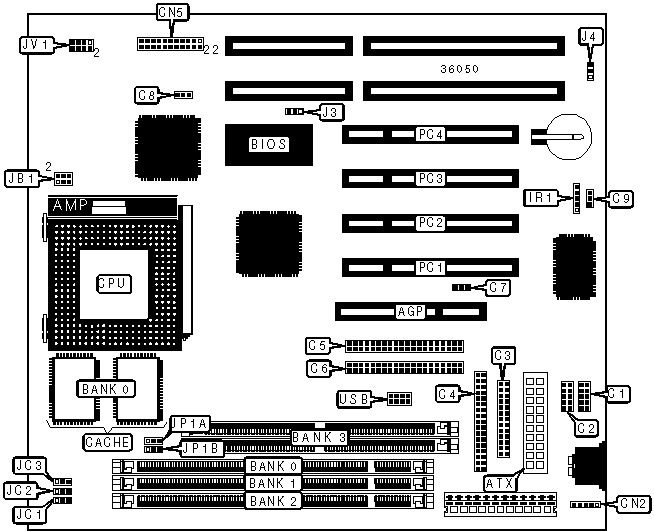 32-bit PCI slots (4), floppy drive interface, green PC connector, IDE interfaces (2), parallel port, PS/2 mouse interface, serial ports (2), IR connector, USB connector, ATX power connector, AGP slot, wake on modem connector