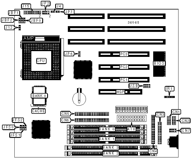 32-bit PCI slots (3), floppy drive interface, green PC connector, IDE interfaces (2), parallel port, PS/2 mouse interface, serial ports (2), IR connector, USB connector, ATX power connector, AGP slot, wake on LAN connector |