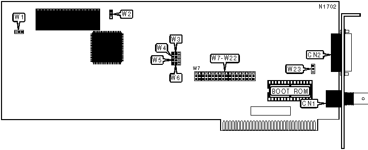 Note:The pins designated should be in the closed position. Note:A total of 40 base address settings are available. The switches are a binary representation of the decimal memory addresses. W22 is the Most Significant Bit and switch W15 is the Least Significant Bit. The switches have the following decimal values: W22=524288, W21=262144, W20=131072, W19=65536, W18=32768, W17=16384, W16=8192, and W15=4096. Turn off the switches and add the values of the switches to obtain the correct memory address. (Off=1, On=0) | |||||||||