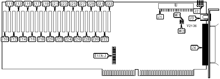 Note: A total of 2047 base address settings are available. The jumpers are a binary representation of the decimal memory addresses. E1/A is the Most Significant Bit and jumper E1/J is the Least Significant Bit. The jumpers have the following decimal values: E1/A=512, E1/B=256, E1/C=128, E1/D=64, E1/E=32, E1/F=16, E1/G=8, E1/H=4, E1/I=2, E1/J=1. Open the jumpers and add the values of the open jumpers to obtain the correct memory address. (Open=1, Closed=0)