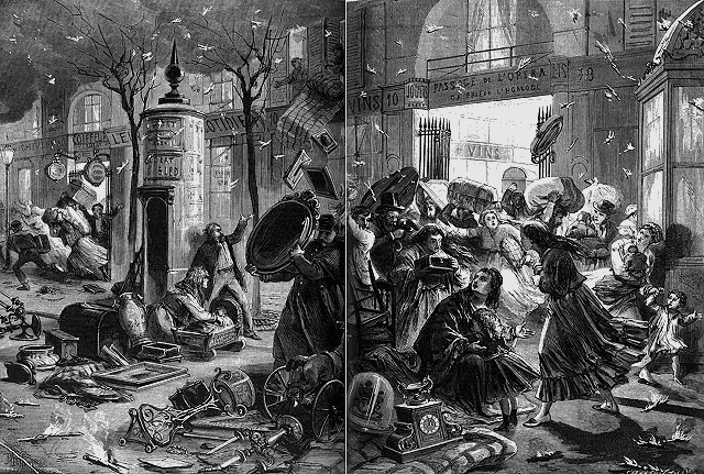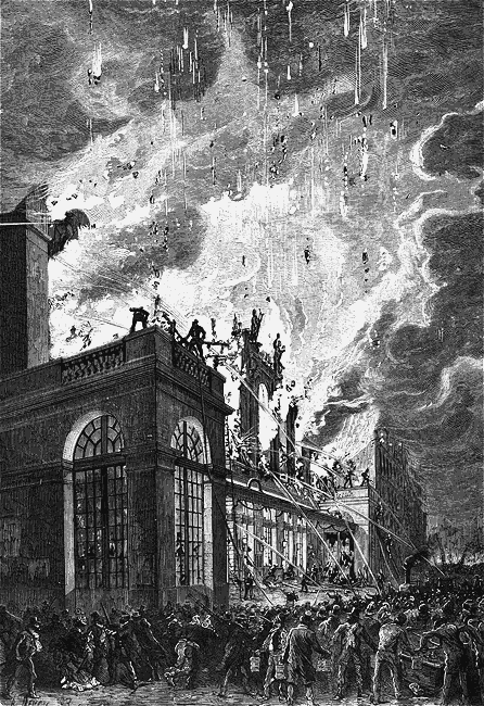 Pendant ce temps on organisait dans les bâtiments de l'administration le sauvetage de tout ce qui pouvait être emporté. A deux heures du matin on n'était pas certain de préserver les bâtiments de la rue Drouot. Les papiers et registres de la direction, les costumes, la musique, les meubles furent transportés dans les dépendances de la mairie. Les archives purent être déménagées avec ordre dans les voitures des commissaires-priseurs, mises immédiatement à la disposition de l'administration.