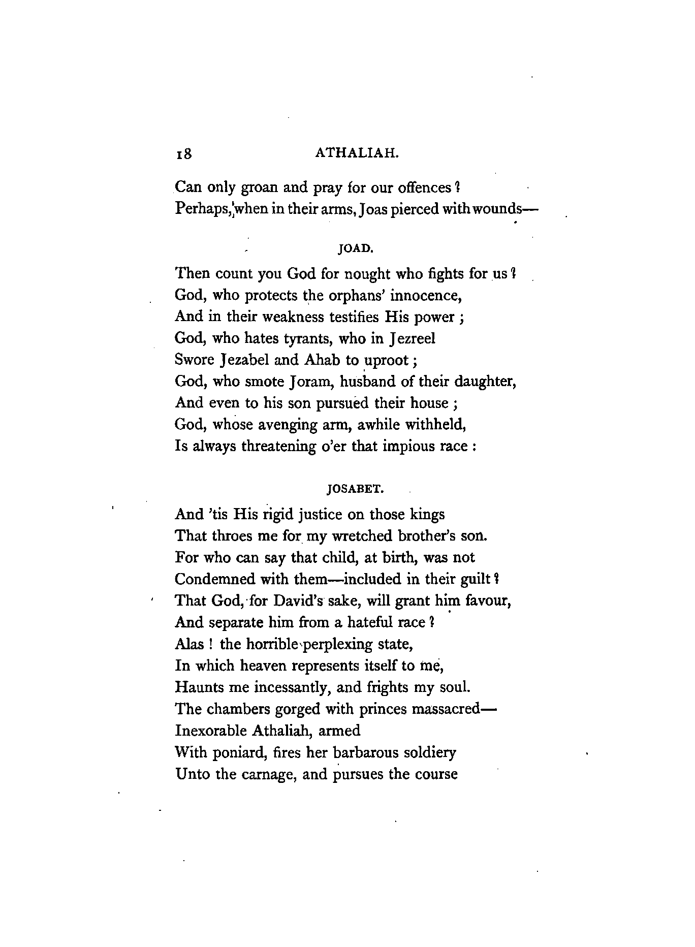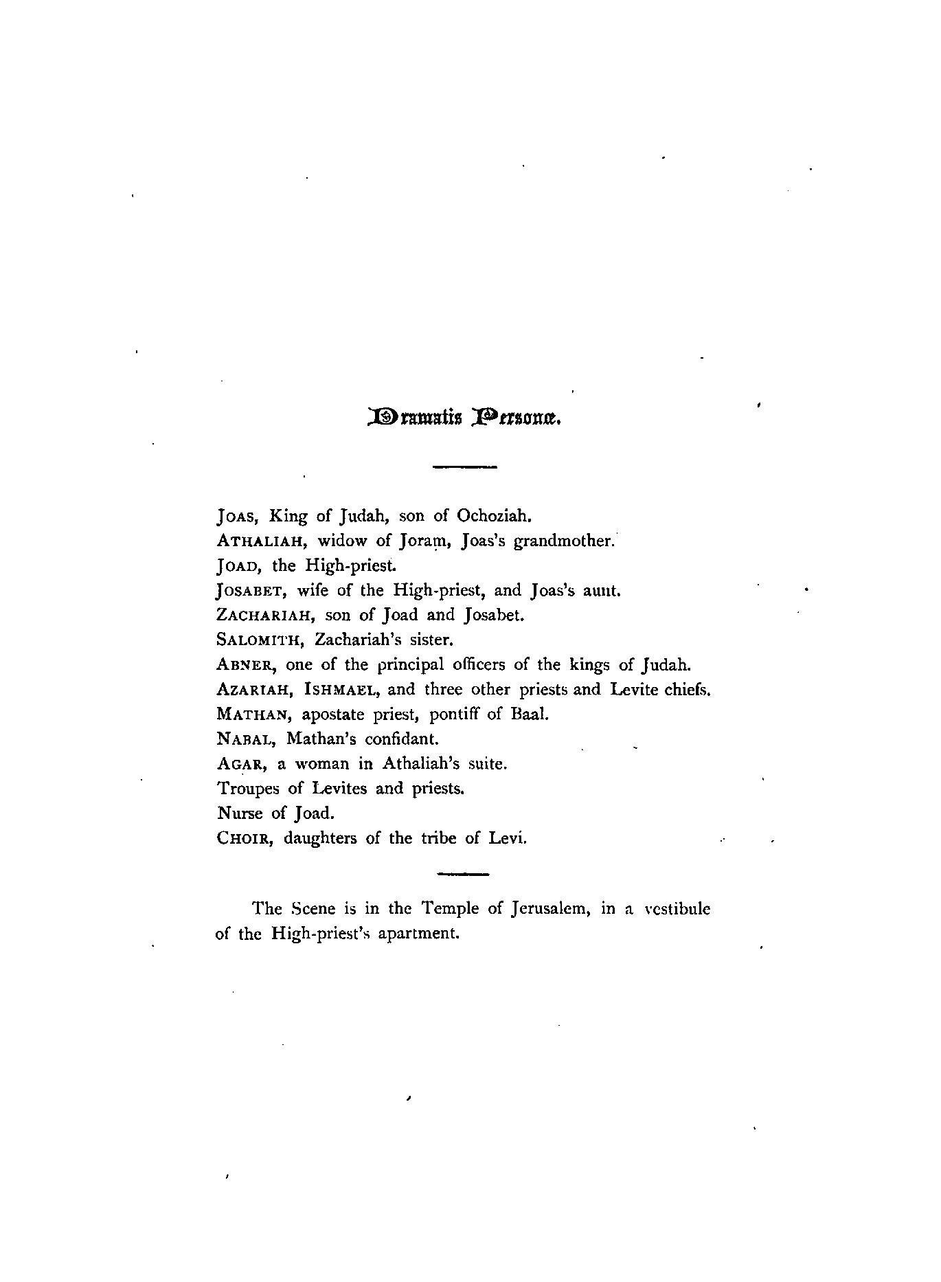 "Athaliah was the daughter of Ahab and Jezebel, who exercised a sanguinary dominion over Israel, and both, (more especially Jezebel,) rendered their reign infamous by their worship of idols, and their cruel persecution of prophets. She had been espoused by Jehoram, king of Judah, son of Jehosaphat, and the seventh king of the race of David. His son, Ahaziah, seduced into idolatry, as well as Jehoram, by the example of Athaliah, after a reign of one year was put to death, together with all the princes of the house of Ahab, by Jehu, whom God had anointed by his prophets to reign over Israel, and to be the minister of his vengeance. Athaliah, irritated by the massacre of her family, undertook on her part to exterminate the royal race of David, and accordingly perpetrated the murder of all the children of Ahaziah, her own grandchildren, Joas, at that time an infant in the cradle, alone escaped the fury of her slaughtering sword: he was rescued by Jehosabeth, the half-sister of Ahaziah (being daughter of Jehoram by a different mother), and wife of the high-priest Joad. It is the establishment of this scion of David upon the throne of his ancestors that forms the subject of this drama."