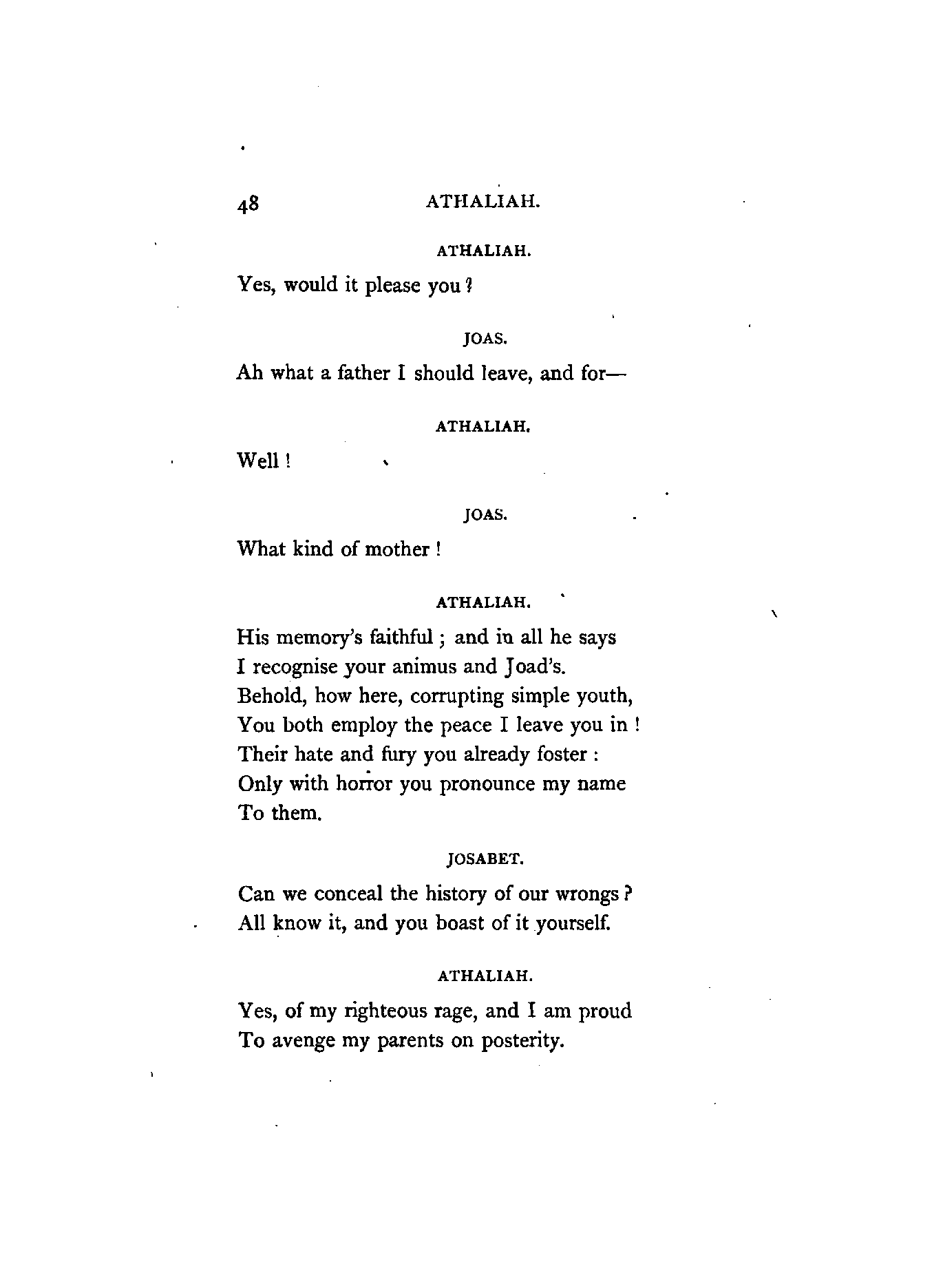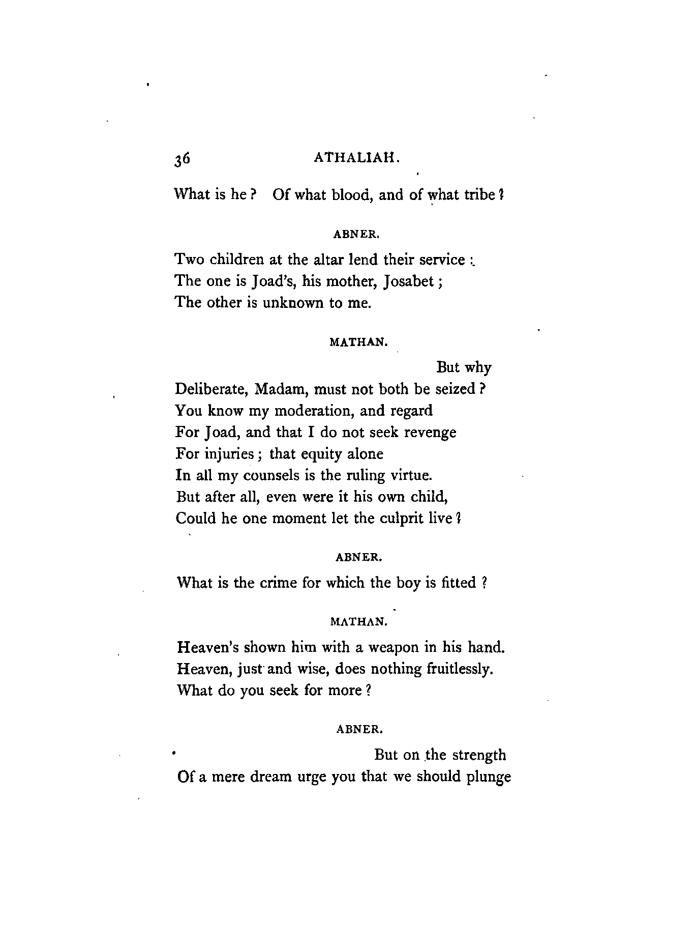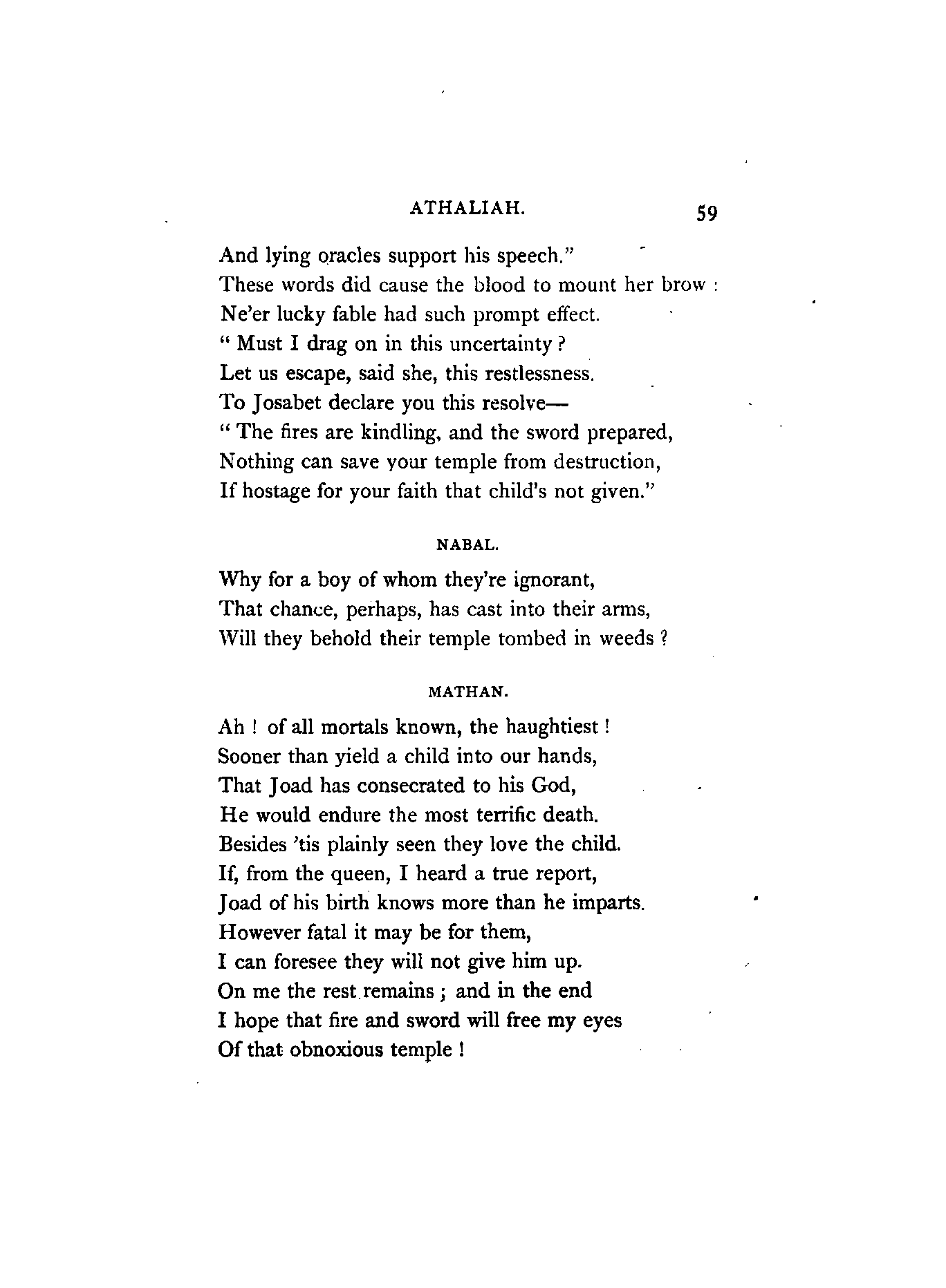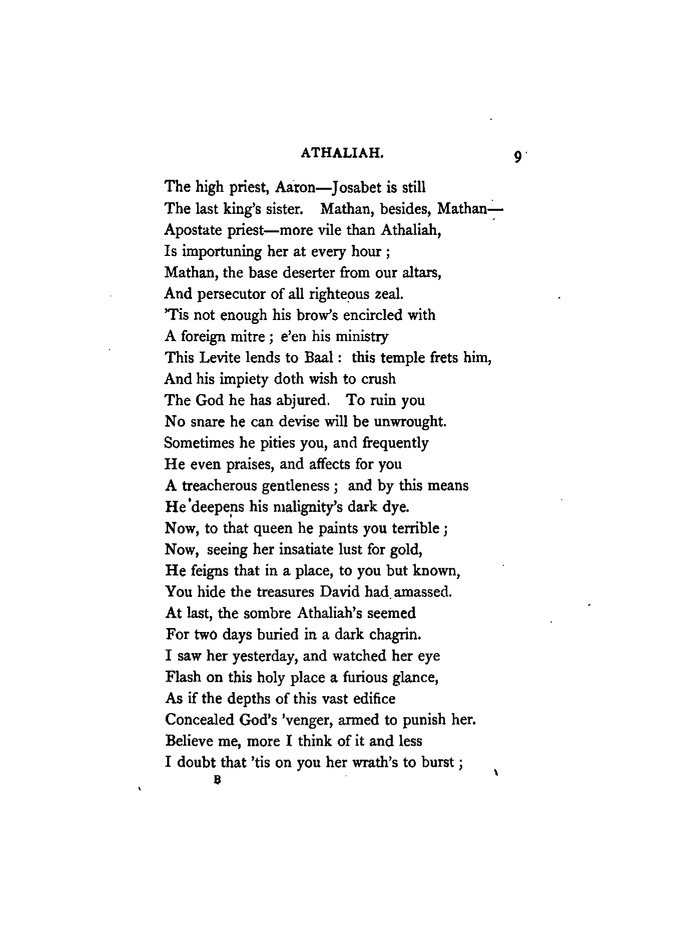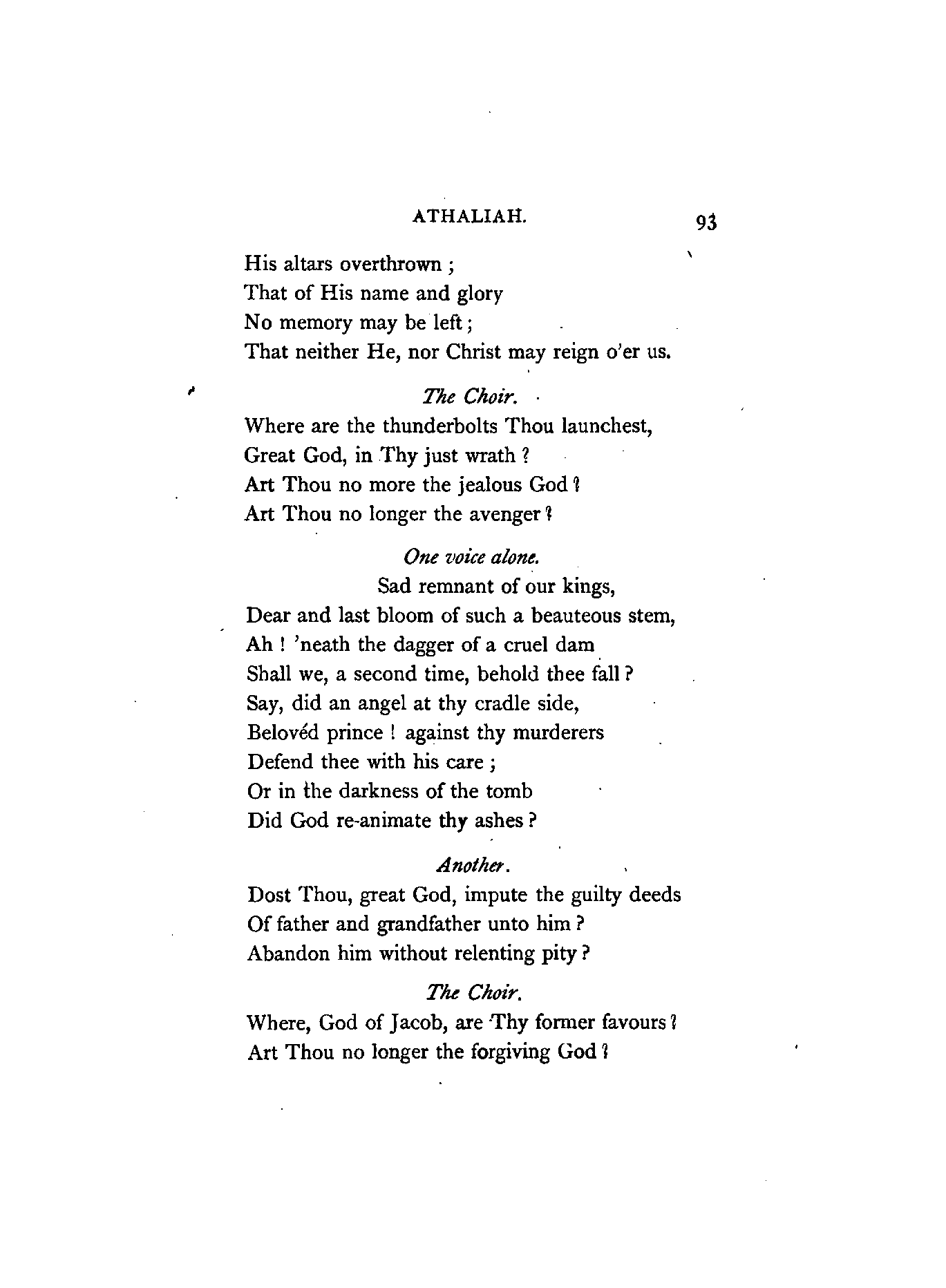 Racine, the author of Athalie (Athaliah), flourished in the latter half of the 17th century. At his appearance, Corneille, the great French Dramatist, was in the full splendour of his fame, whose rival he was afterwards recognised to be. Athalie is a Tragedy in rhyme, consisting of six Iambic feet, similar to the Alexandrine verse found occasionally in our English poets at the termination of a sentence or paragraph. Dryden, and a few others of less note, in the reign of Charles IL, introduced the rhyming drama to the English public; but the clank of its fetters was unpleasant to the British ear, which had become attuned to the freedom and majesty of blank verse. Blank verse, therefore, being our recognised vehicle of dramatic productions, has been employed in this translation. I did, however, intend in the first place to render the chorus into rhyme; but after maturer consideration it appeared to me that irregular blank verse would be more capable of tragic expression; and that it would also be more in harmony with the [4]Hebrew rhythm as represented by the scriptures, from which the plot was appropriated.