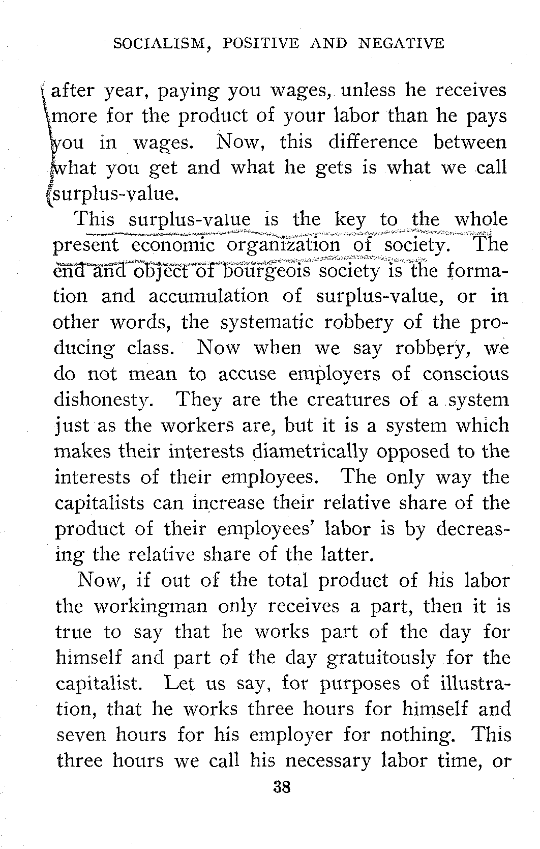 We Marxians are often accused of neglecting the intellectual factor and, as Deville says, a[33] whole syndicate of factors; but we do not neglect them. We recognize their existence and their importance, but we do refuse to waste our revolutionary energy on derivative phenomena when we are able to see and recognize the decisive, dominant factor, the economic factor. As Deville says, we do not neglect the cart because we insist upon putting it behind the horse instead of in front of or alongside of him, as our critics would have us do. Now, if the economic factor is the basic factor, it behooves us to understand the present economic system—Marx's Law of Surplus-Value is the key to this system.