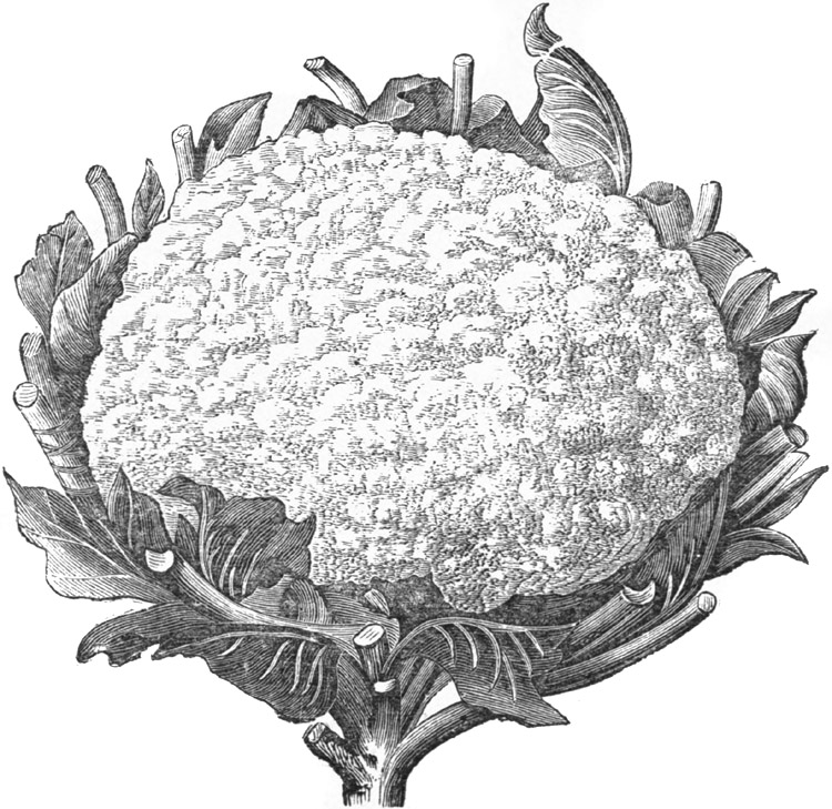 [Pg 15]John Rogers, in his "Vegetable Cultivator" (London, 1843), said: "There are two varieties of the cauliflower, the early and the late, which are alike in their growth and size, only that the early kind, as the name implies, comes in about a week before the other, provided the true sort has been obtained. There is, however, no certainty of knowing this, unless by sowing the seed from the earliest sorts, as is the practice of the London kitchen gardeners. The early variety was grown for a number of years in the grounds called the Meat-house Gardens, at Millbank, near Chelsea, and was of a superior quality, and generally the first at market. The late variety is supposed to have originated from a stock for many years cultivated on a piece of ground called the Jamaica level, near Deptford, and which produced uncommonly fine heads, but later than those at Millbank. Both soils are nearly similar, being a deep rich loam, on a moist subsoil, and continually enriched with dung. Both the varieties are of a delicate nature, being generally too tender to resist the cold of the winter season without the occasional aid of glasses or other means; and the sight of many acres overspread with such glasses in the vicinity of London gives a stranger a forcible idea of the riches and luxury of the capital."